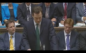 Throughout the Budget, the above screen shot was typical of the television coverage. I thought where is Cameron? Osborne appears to be flanked by two Lib Dem MPs; Nick Clegg and Danny Alexander.