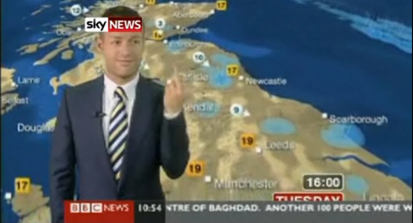 And here's the full footage courtesy of YouTube:Tomasz Schafermaker made the gesture at presenters Simon McCoy and Fiona Armstrong on the BBC News channel.