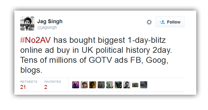 How strange that the biggest one day blitz regarding online advertising happened to involve MessageSpace which is a company where Singh is an investor...a man who happened to be the Digital Director of the No2AV campaign.